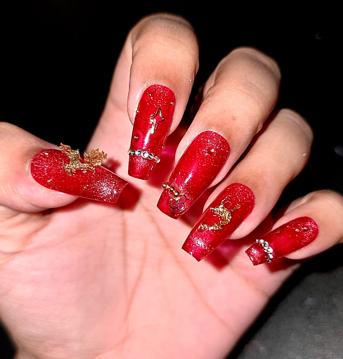 This premium nail set features ten meticulously crafted red glitter nails, each adorned with luxurious gold embellishments including reindeer charms, stars, rhinestones, and delicate chains. Designed for effortless application and long-lasting wear, these press-ons bring salon-quality glam to your fingertips in minutes.