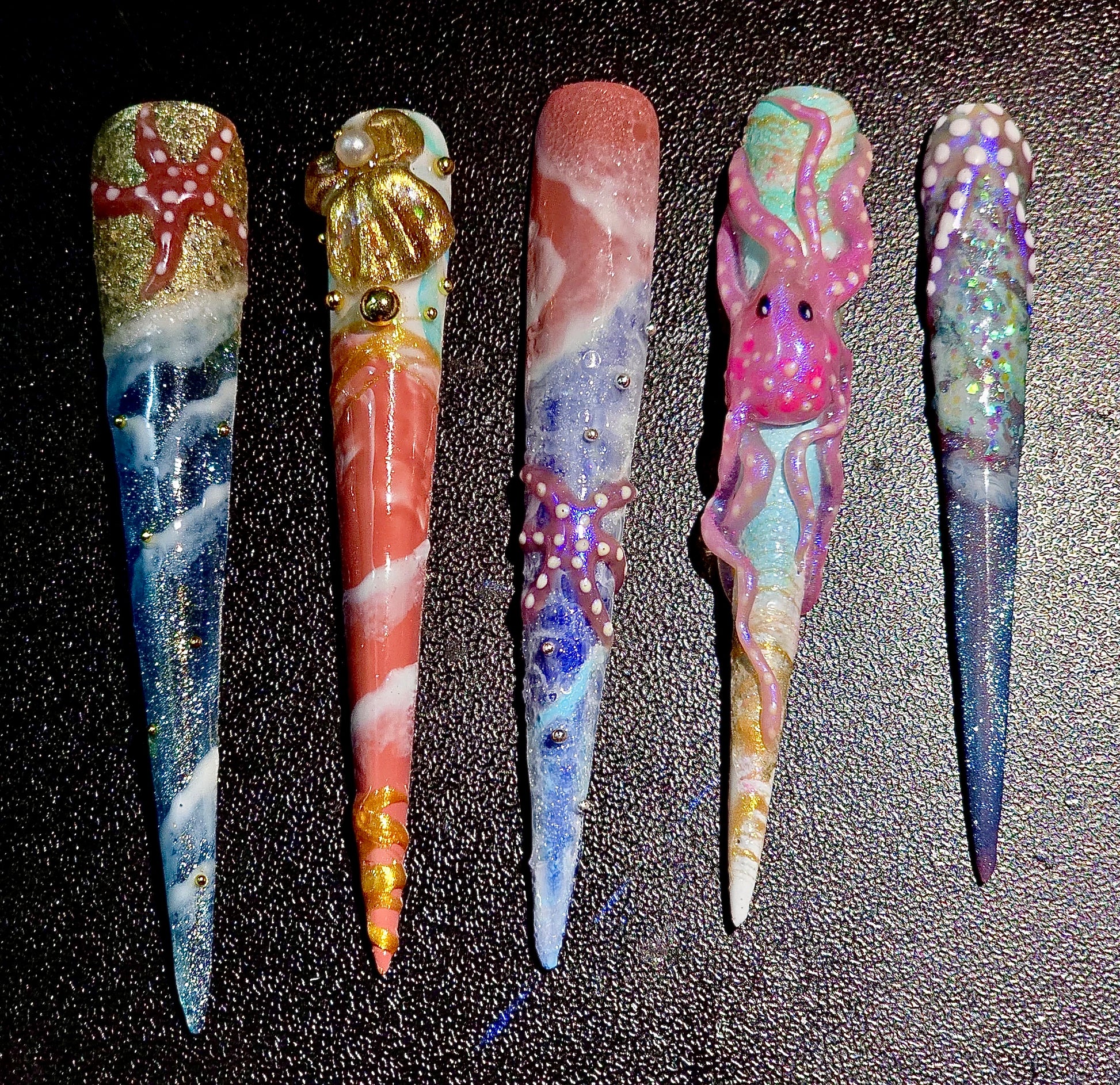 Dive into an oceanic wonderland with this unique set of press-on nails, inspired by the magical depths of the sea. Each nail showcases meticulous hand-crafted details, including dimensional octopus and starfish figures, sparkling shells, and shimmering underwater textures that echo the beauty of coral reefs and tidal waves.